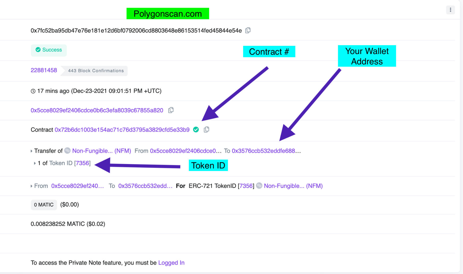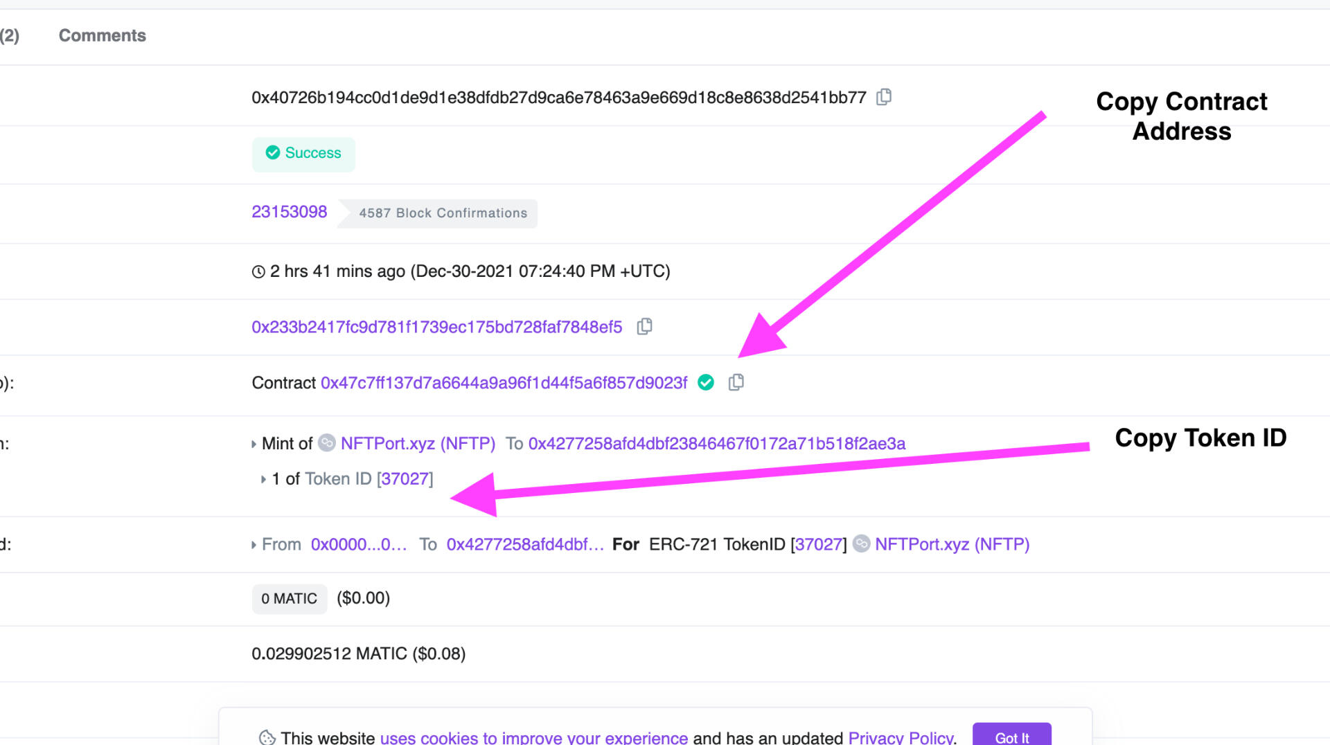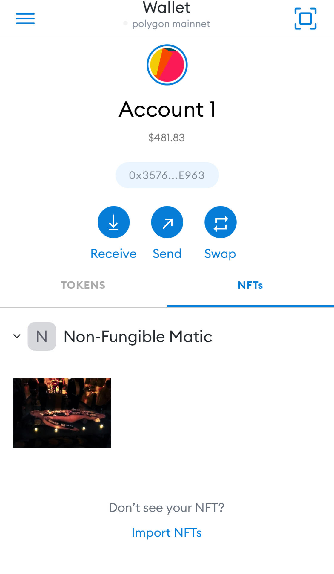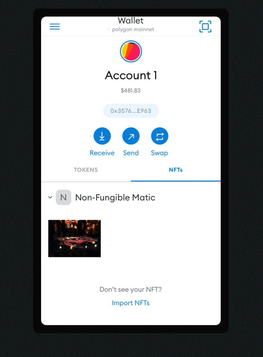 Once we mint your NFT its contract address and unique token id will become visible on the Polygon blockchain. Visit Polygonscan.com and enter your wallet address in the search field to view the transaction details of the NFT we sent you. Copy the contract address and token id as shown on this image. Then open up your mobile wallet and look for NFTs tab.