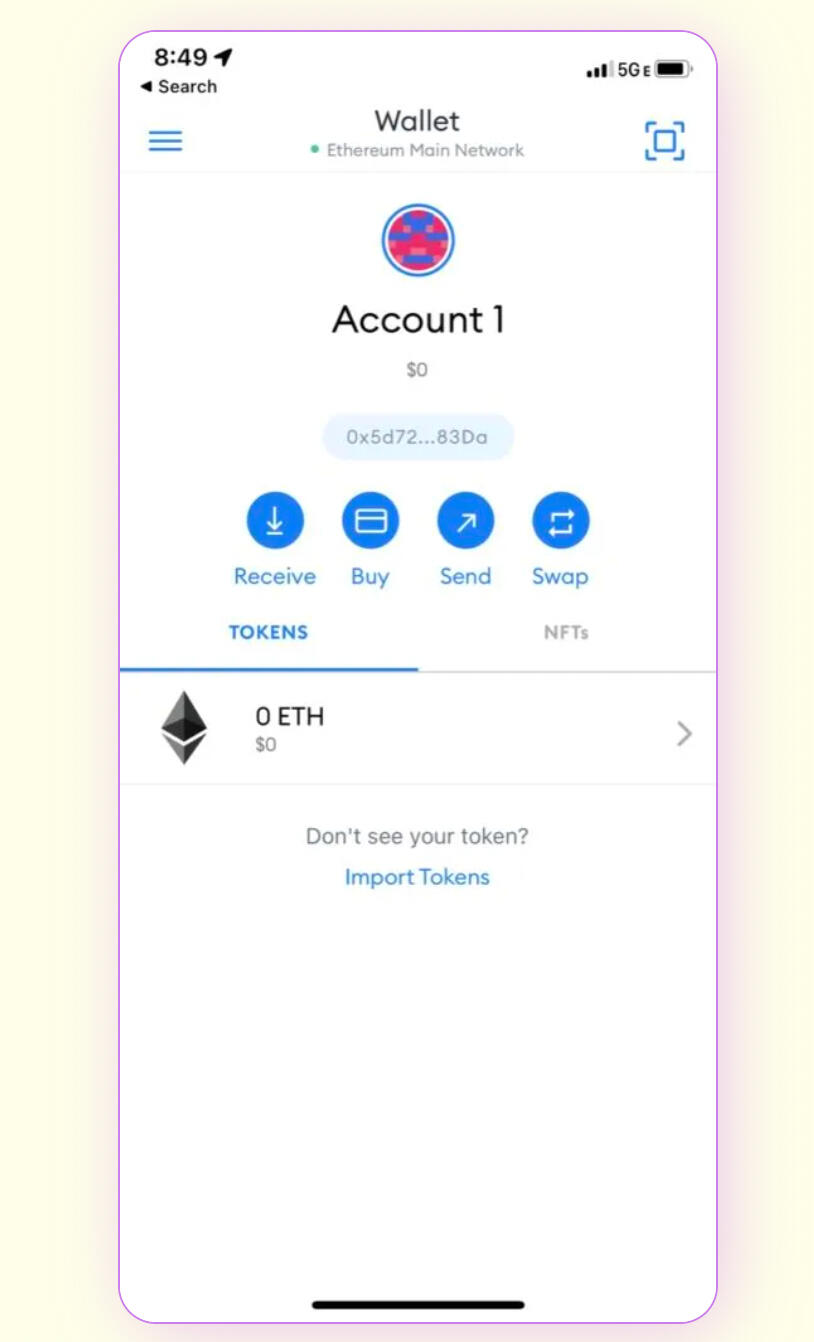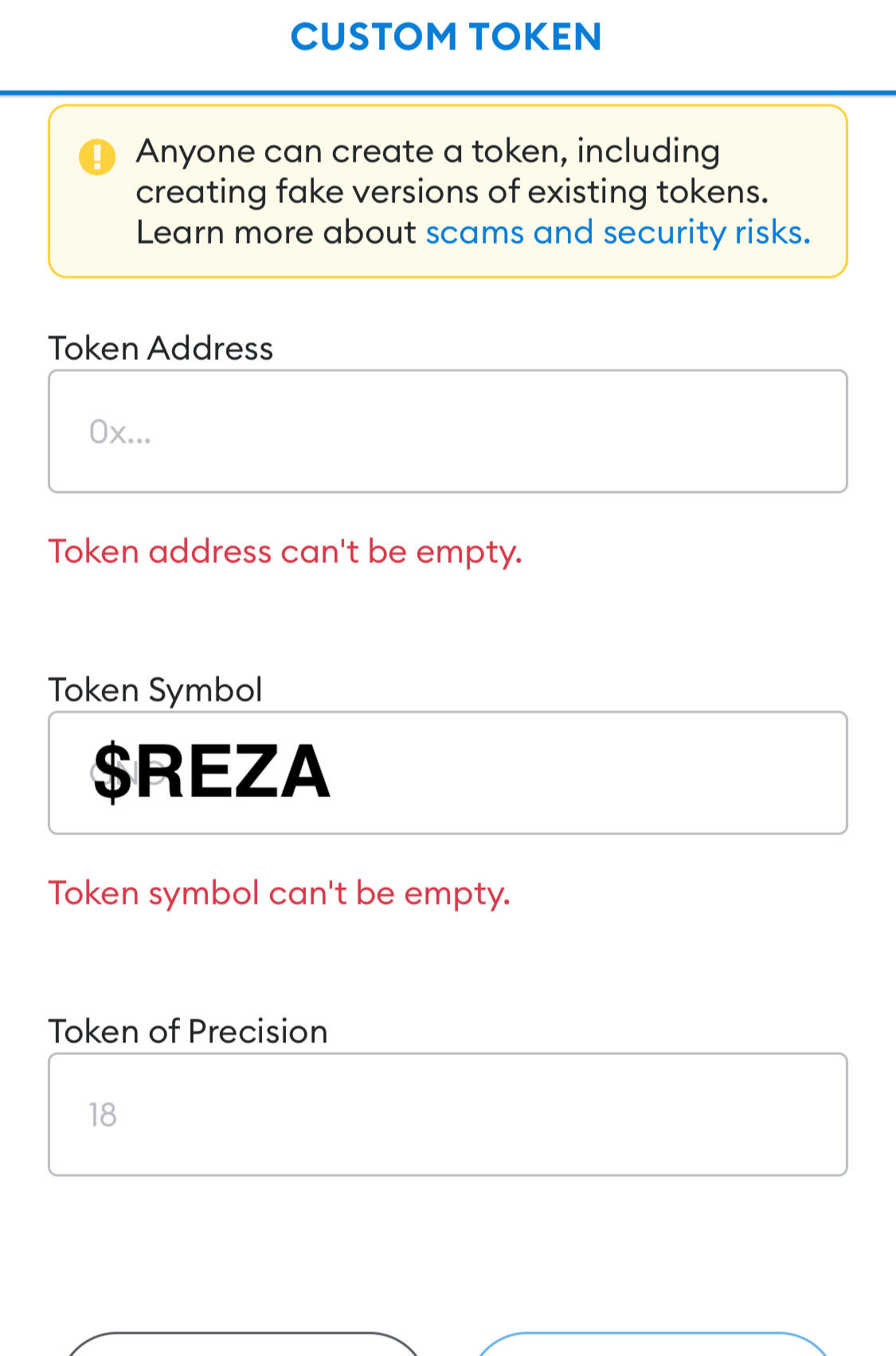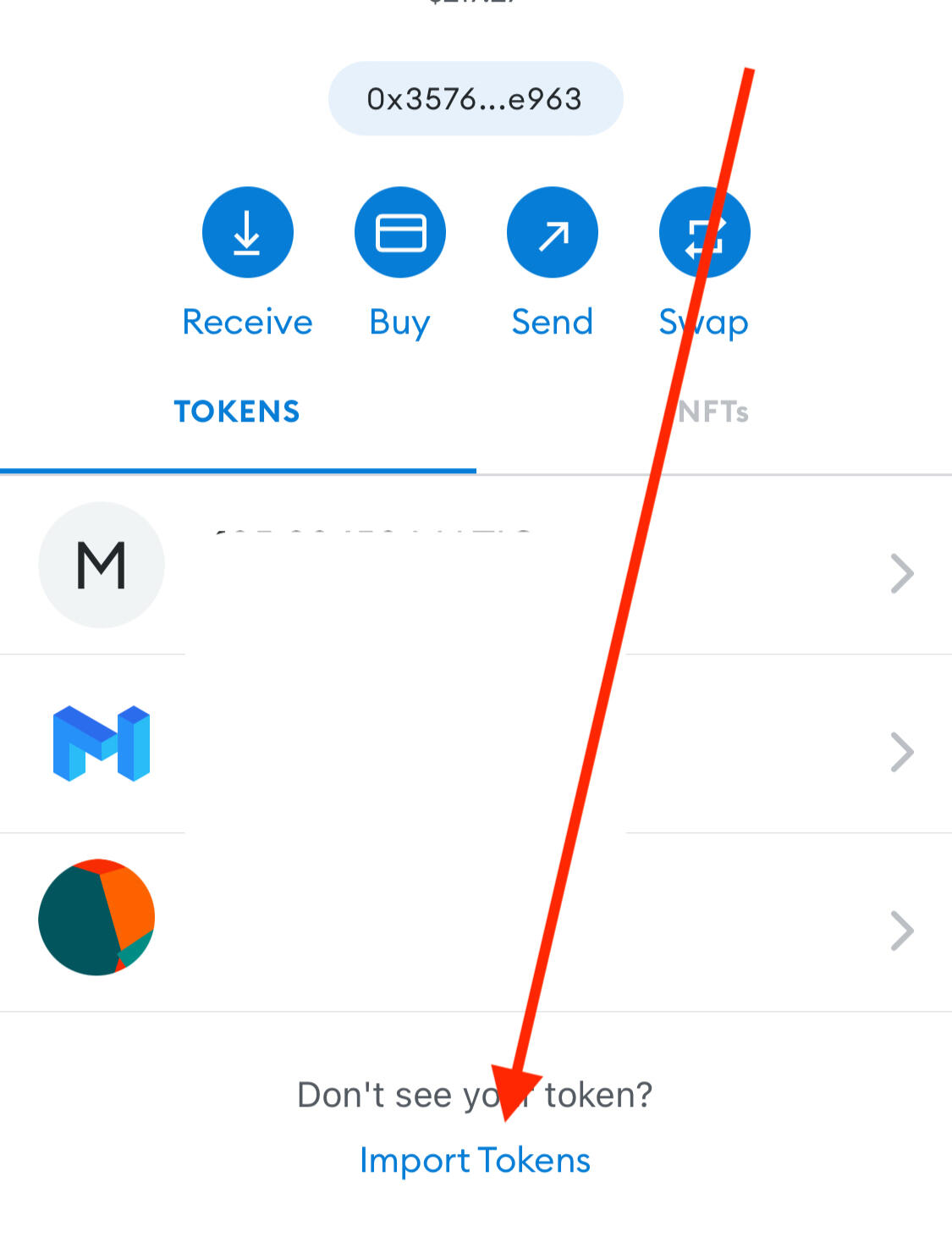 While your wallet may automatically import the NFT we send to its address, in most cases your NFT will not automatically appear in your MetaMask wallet. Simply click on Import NFTs to open up the next screen. To import your $REZA token, click on ERC20 tokens tab on Polygonscan and inside MetaMask click on import TOKENS tab.