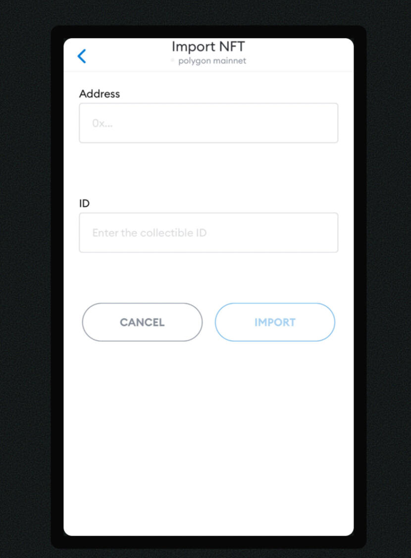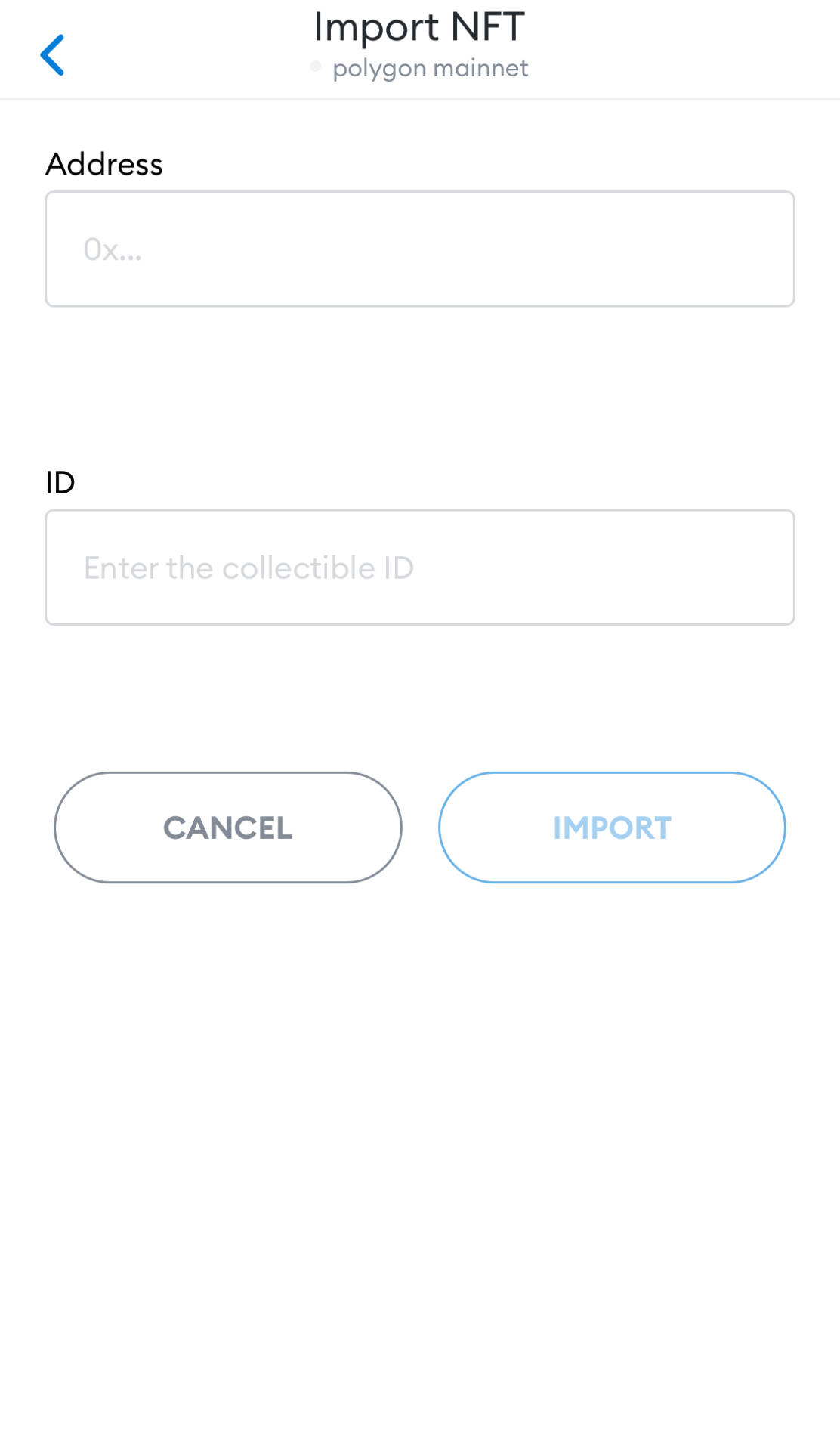 Paste inside the applicable fields (Address and ID fields) your NFT contract address and token id that you had earlier copied from Polygonscan.com. Next click IMPORT. Your NFT should appear inside your wallet within a minute. $REZA tokens will not have a unique token id.
