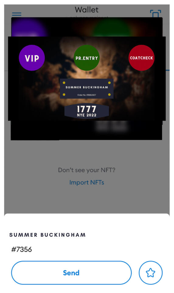 When you arrive at the venue please open your wallet app and click on your NFT to display it. Your NFT will contain the event name, your name, ticket type and any additional items you may have purchased, such as priority entry and coatcheck service.