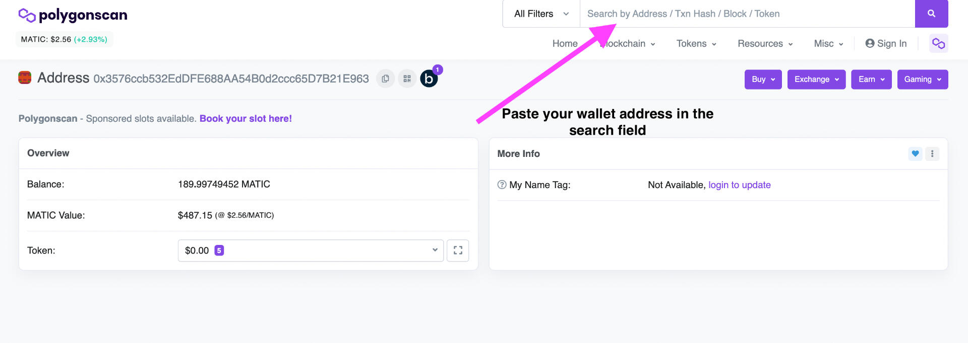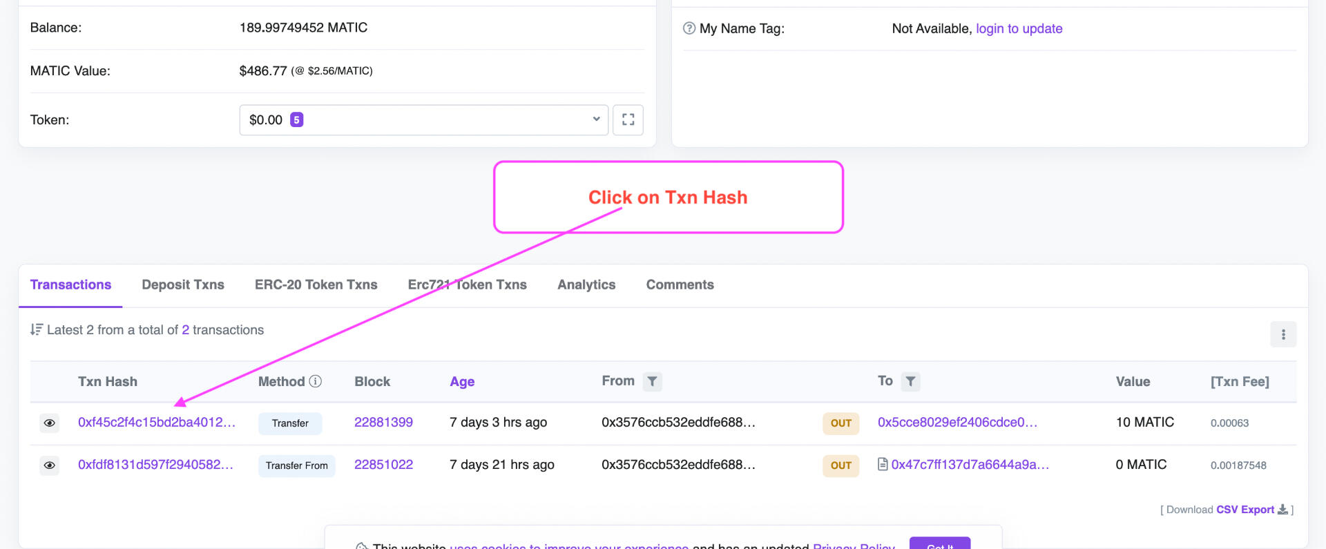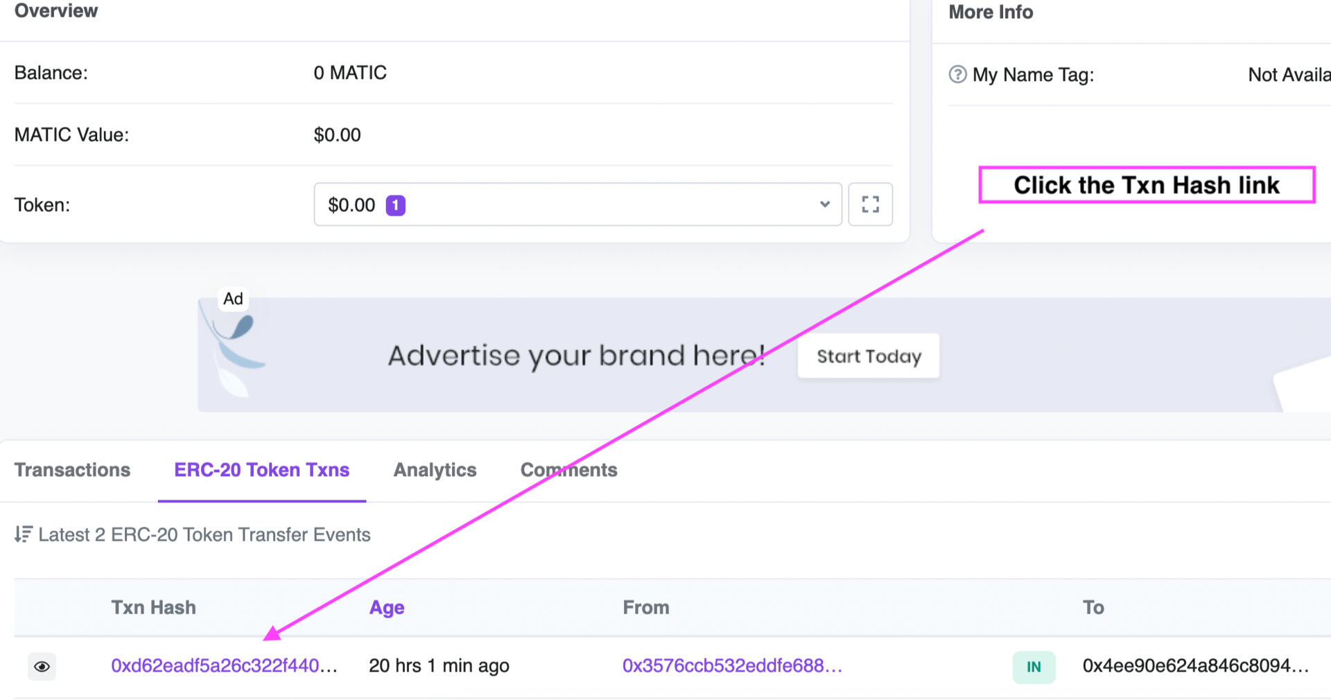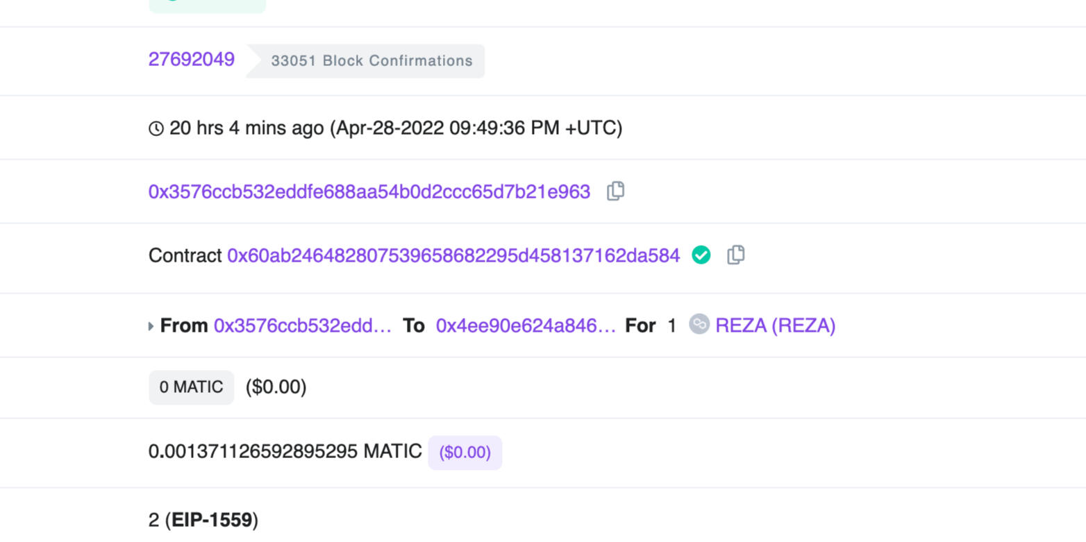 On Polygonscan.com enter your wallet address in the search field and look for $REZA under the ERC-20 Token Txns tab. Click the Txn Hash link.